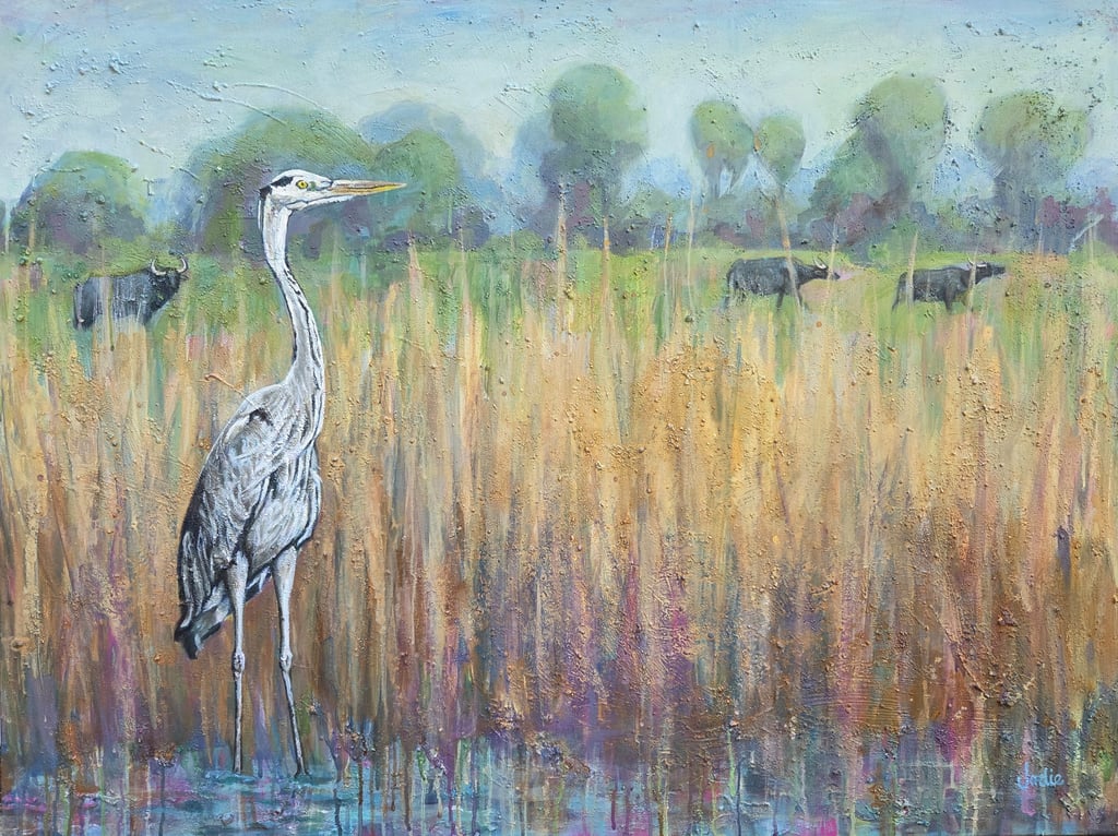 Through these paintings I wish to conjure up the relationship and the mingling of the creatures, people and place, and I wish to tell the story of migration, habitat and interbeing.