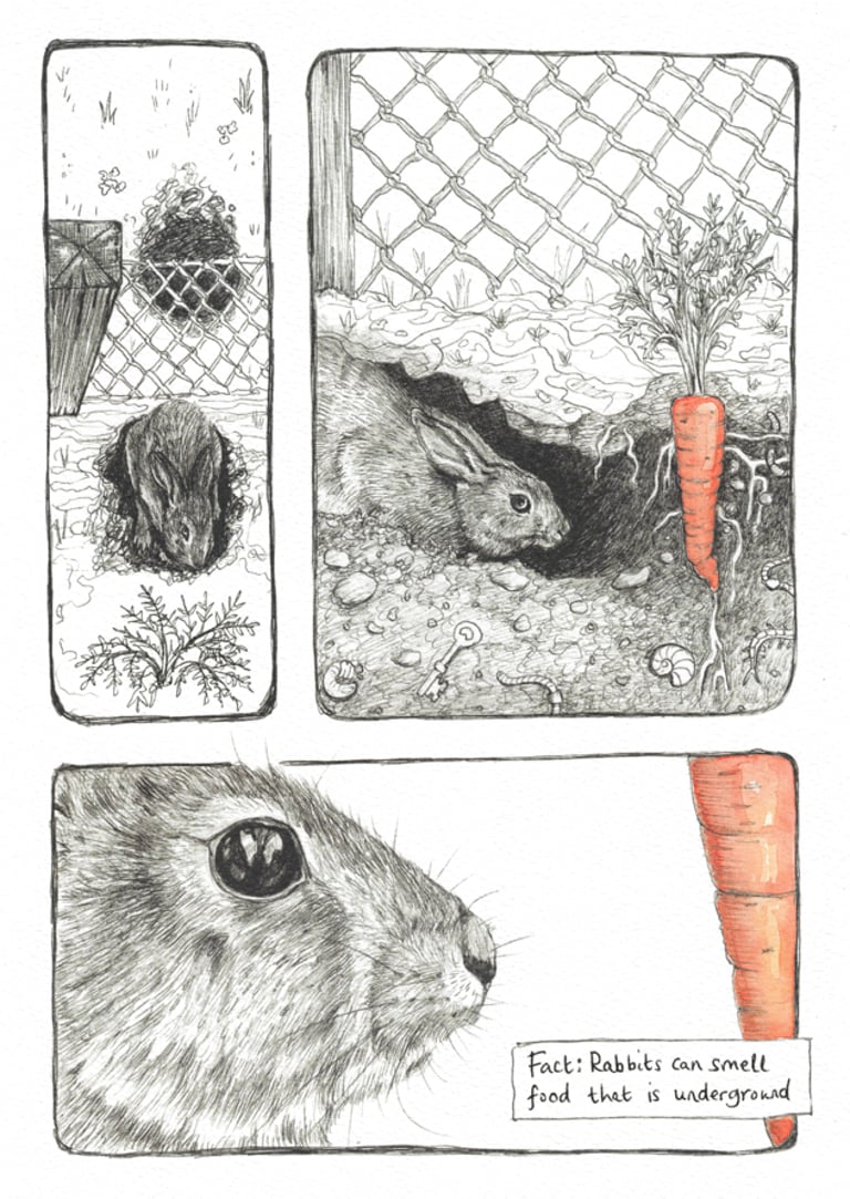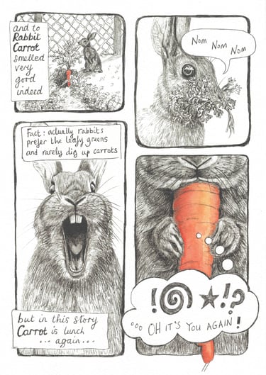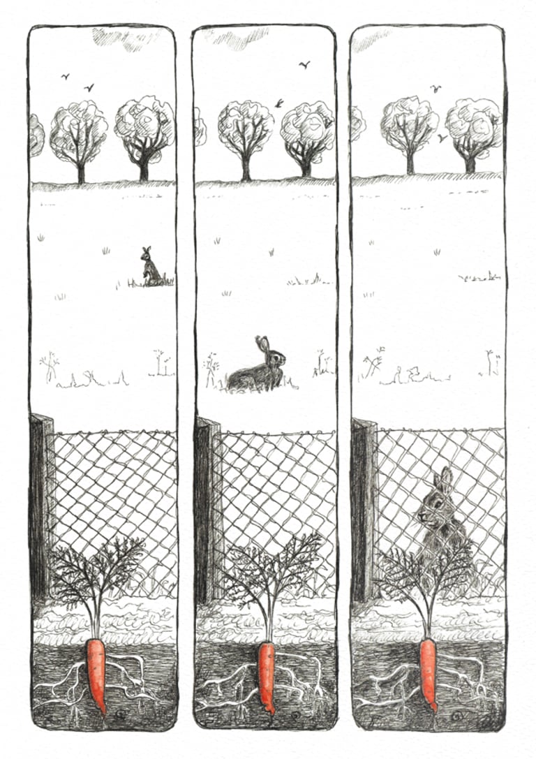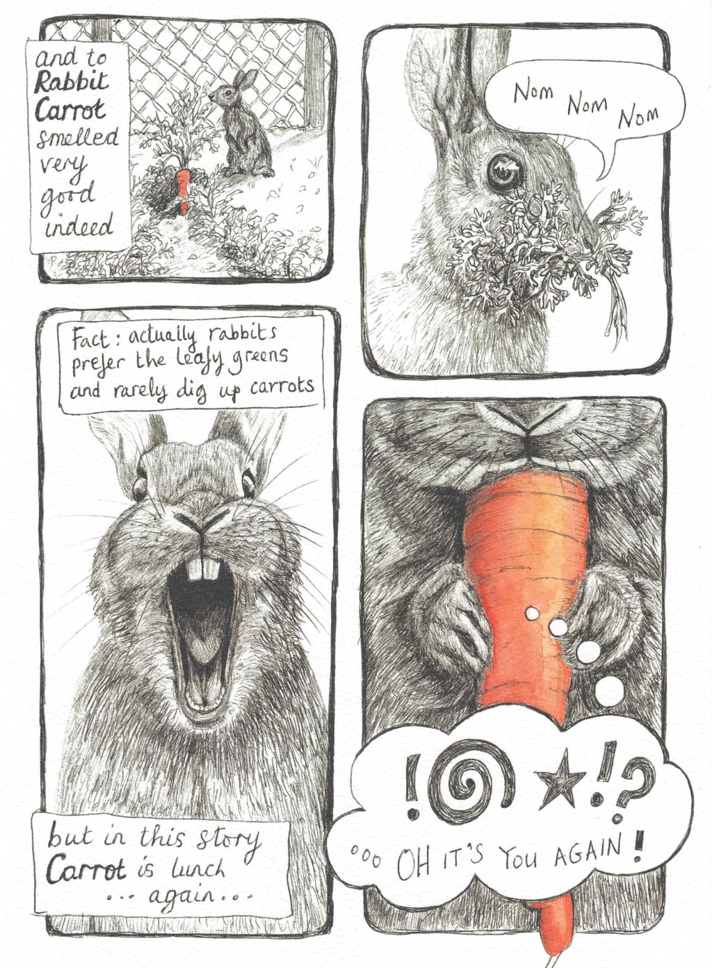 ‘Carrot’ is a story I made up for my youngest. To her, Carrot’s story was amusing, but also fascinating and comforting, for me too. So, when I started making art as a calming daily practice, I chose to illustrate Carrot first from among the other stories that I have waiting in line.