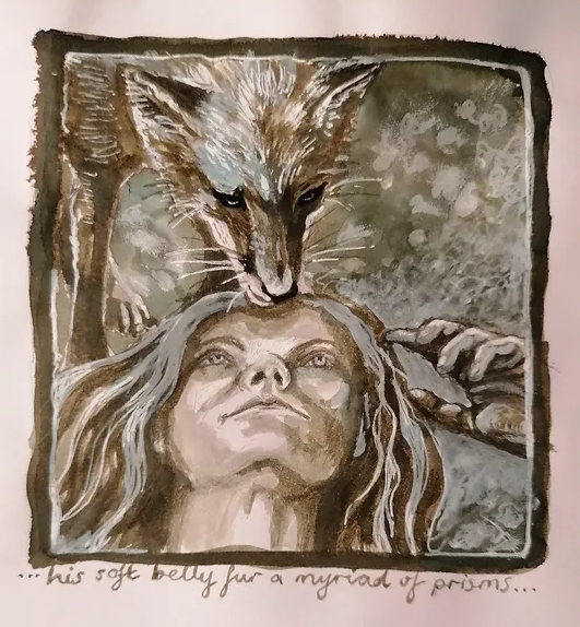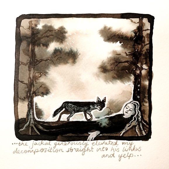I lay down on the dry baked soil in the rut of the heavy fat tyred vehicle that passed this way to collect the logs... Logs; corpses of trees actually. The hard lumps of broken soil dig into my back but I lie motionless and close my eyes against the merciless sun. Jackal turns back and stands over my head. His soft belly fur a myriad of prisms, colours of autumn and fluff of dreams. He stands patiently blocking the sun from me, and my eyes from the blindness, from the despair.