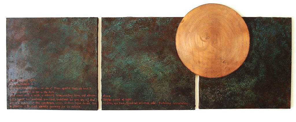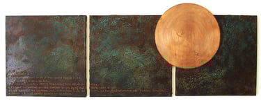Green Flicker. copper disc and mixed media on canvas x 3. 50 x 50cm