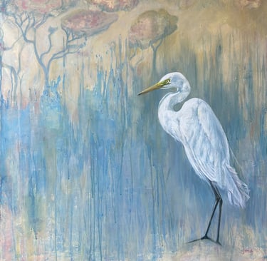 Through these paintings I wish to conjure up the relationship and the mingling of the creatures, people and place, and I wish to tell the story of migration, habitat and interbeing.