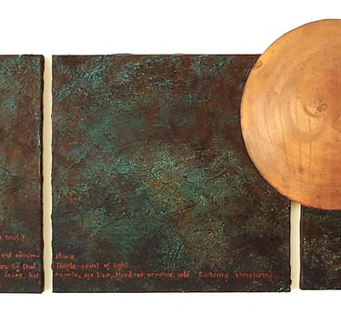 Green Flicker. copper disc and mixed media on canvas x 3. 50 x 50cm